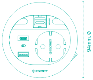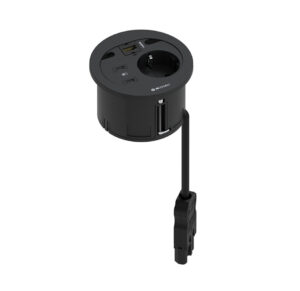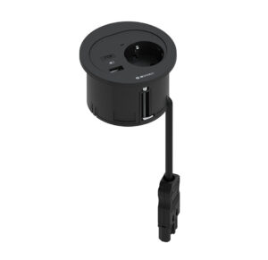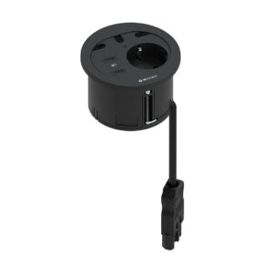 Divus allows to integrate all the connectivity needs of a workstation in only 80mm diameter, combining 1 power outlet, up to 2 USB charging connections, 1 data or multimedia connector and 2 cable grommets.