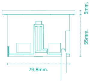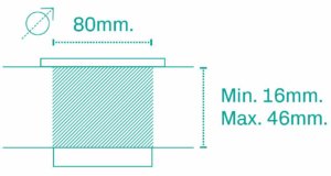 - Surface installation in circular cut-out of 80mm diameter by means of sliding fixings with return, adaptable to desk boards from 16mm to 46mm thick.